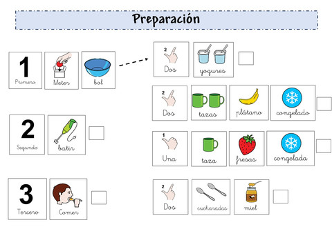 Con el comienzo del verano y el fin de las clases que mejor manera de entretenerse que haciendo recetas en familia. Os mostramos una receta adaptada mediante el empleo de pictogramas para elaborar helado de fruta congelada. Debido a la sencillez de la receta se puede utilizar como un recurso estupendo para introducir a los más pequeños en el mundo de la cocina a la vez que trabajamos y fomentamos la autonomía.